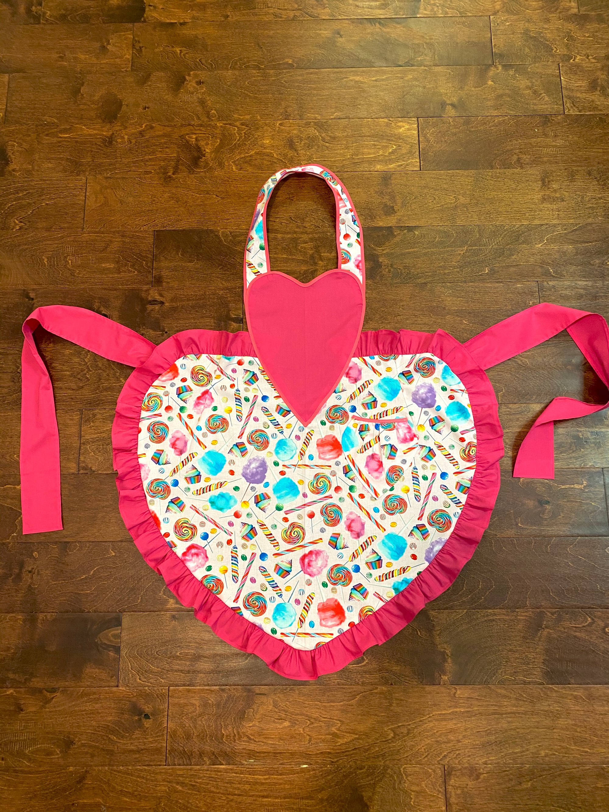 Who doesn’t want to be cute like Princess Lolly?! This Candyland inspired Heart Apron is two hearts sewn together with a bright pink two inch ruffle all the way around. Also has a single acorn pocket for a phone or other small knick-knacks.